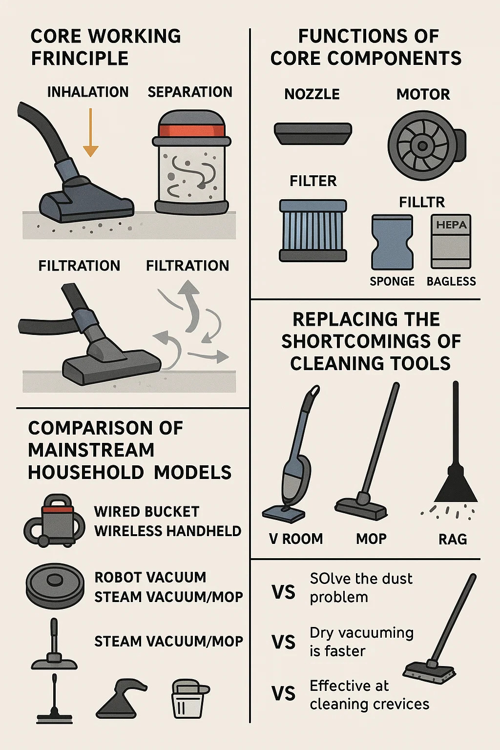 Operații cheie: ▶ Inhalare - Motorul se rotește, creând o zonă de joasă presiune. Aer, purtând praf, se grăbește în duza de aspirație; ▶ Separare - Amestecul de praf -aer se învârte în coșul de praf, ceea ce face ca particulele grele să cadă în cutia de colectare a prafului; ▶ Filtrare - Praful fin este prins de filtru, iar aerul curat este descărcat din spate.